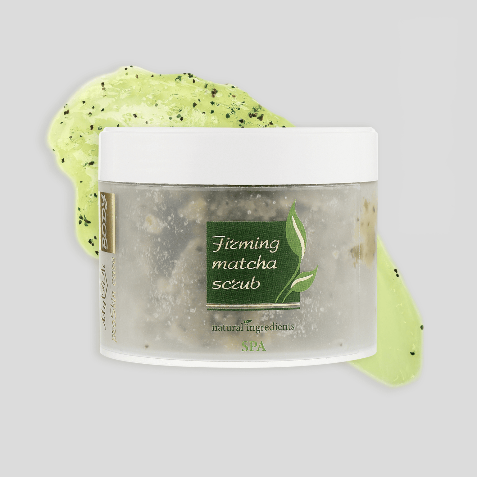Зміцнювальний скраб для тіла ефективно видаляє ороговілі клітини, відновлює пружність та еластичність шкіри. Завдяки гідролату матчі скраб містить велику дозу кофеїну, яка допомагає тримати шкіру в тонусі та пришвидшує в ній обмін речовин